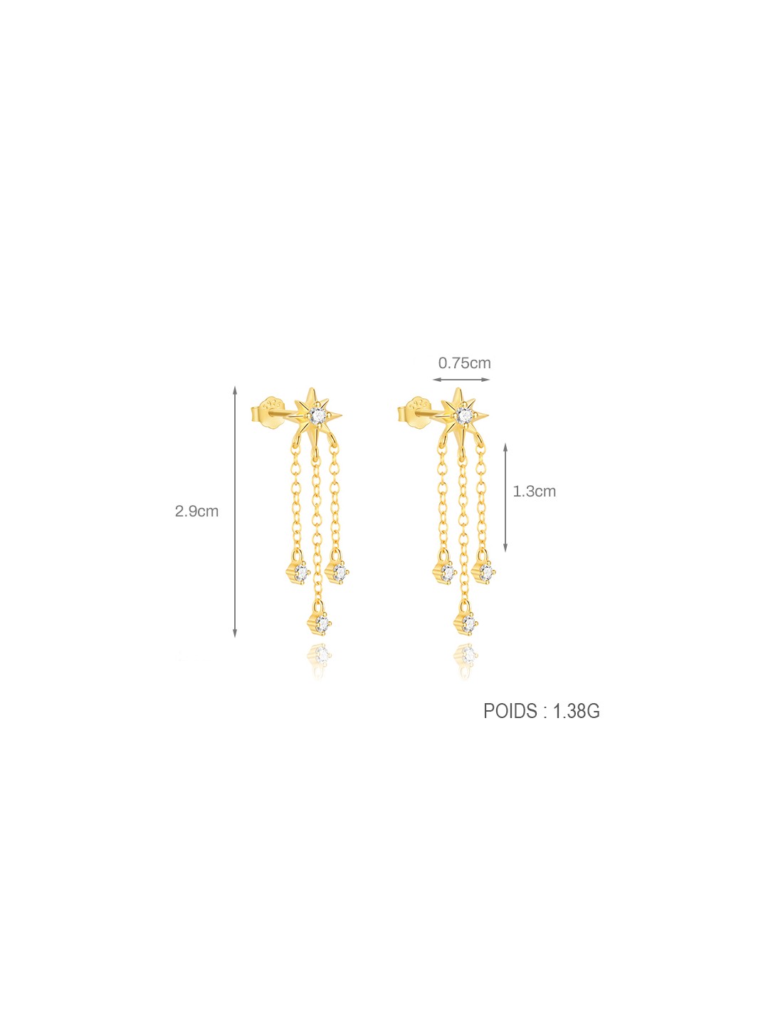 Ces boucles d’oreilles en argent 925/000 doré à l'or fin séduisent par leur design délicat et contemporain. Deux puces avec 1 étoile pour motif et 3 fines chainettes filantes, apportant un mouvement leger à l’ensemble.