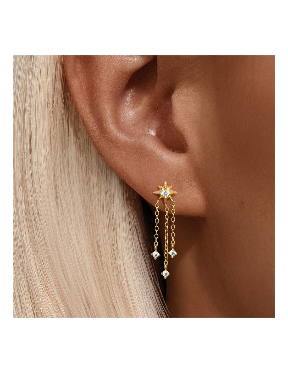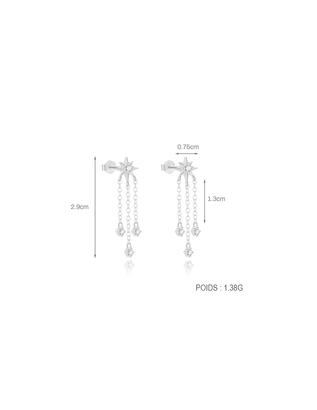 Ces boucles d’oreilles en argent 925/000 séduisent par leur design délicat et contemporain. Deux puces avec 1 étoile pour motif et 3 fines chainettes filantes, apportant un mouvement leger à l’ensemble.