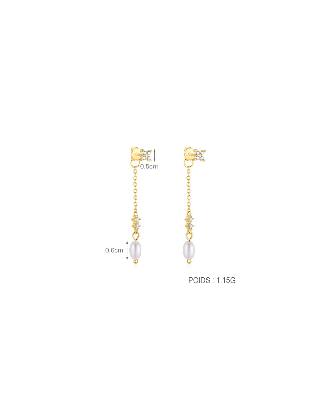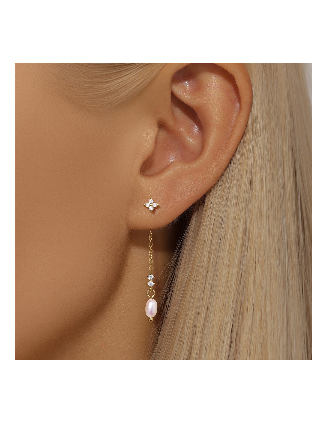 Ces boucles d’oreilles en argent 925/000 doré à l'or fin séduisent par leur design délicat et contemporain. Deux puces motif fleur en zirconium accroché sur le fermoir papillon une chainette avec au bout une perle d'eau douce.