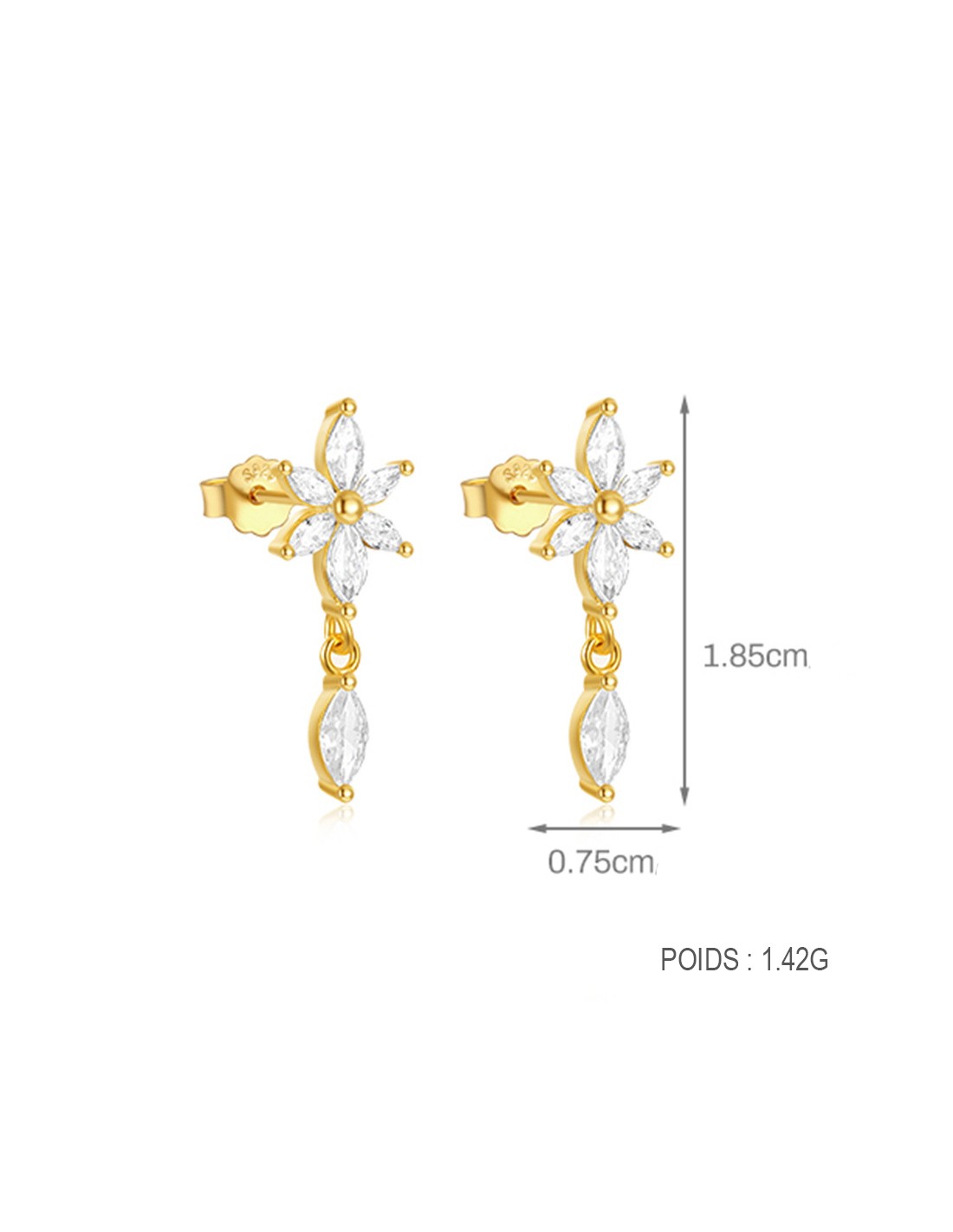 Ces boucles d’oreilles en argent 925/000 doré à l'or fin séduisent par leur design délicat et contemporain. Deux puces à motif fleurs avec une pampille en forme de pétale.
