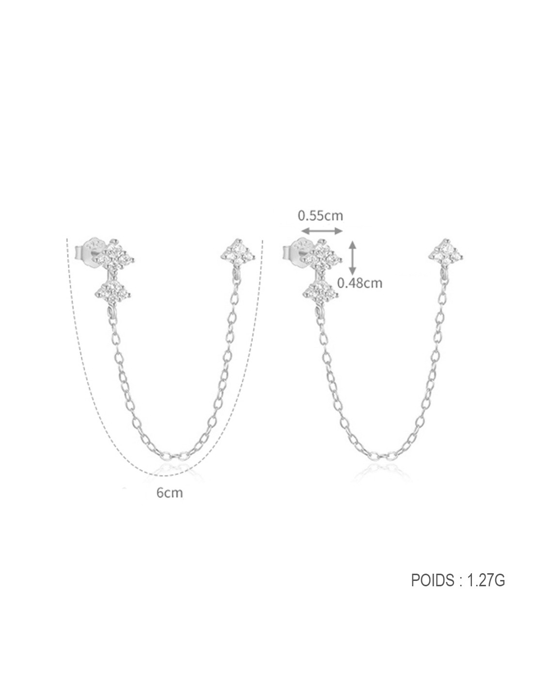 Ces boucles d’oreilles en argent 925/000 séduisent par leur design délicat et contemporain. Deux puces avec zirconiums, nécessite que la personne doit être percée deux fois sur la même oreille pour pouvoir le porter.