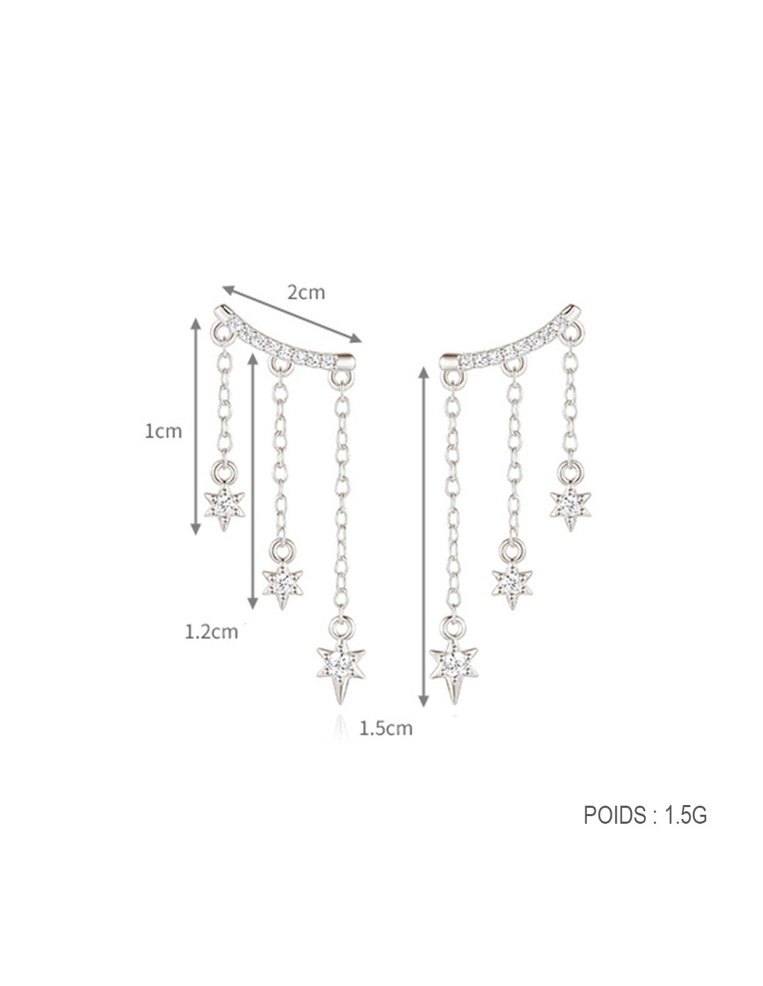 Ces boucles d’oreilles en argent 925/000 séduisent par leur design délicat et contemporain. Deux puces avec une barre ornée de zirconiums et trois chainettes avec des étoiles pendantes.
