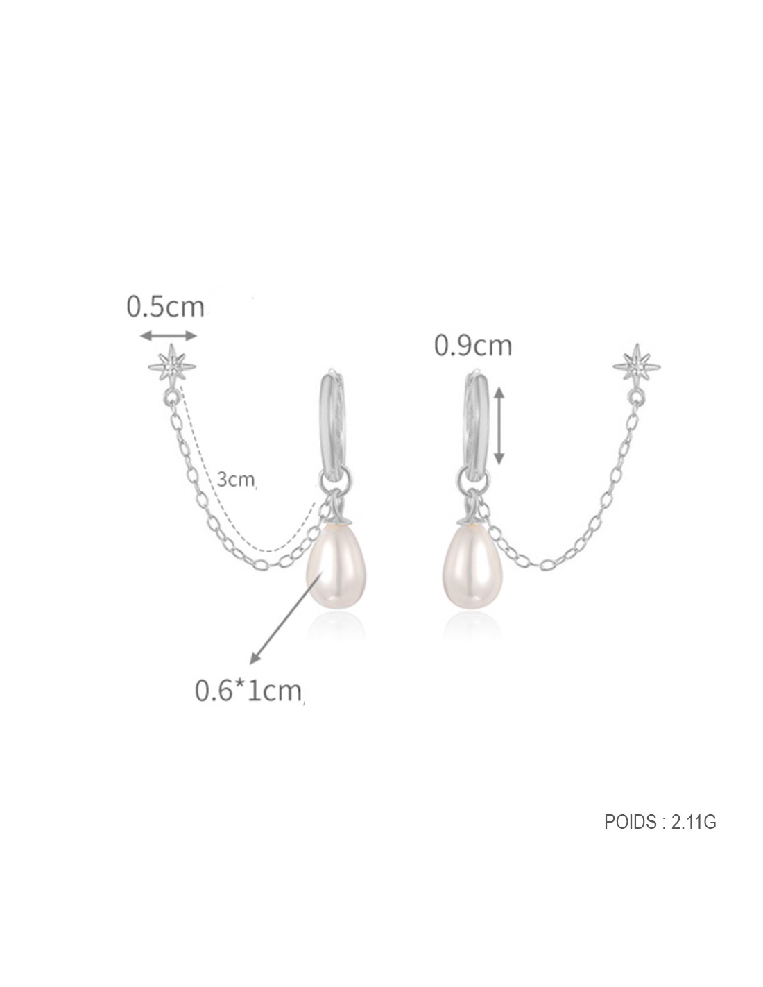 Ces boucles d’oreilles en argent 925/000 séduisent par leur design délicat et contemporain. Deux créoles avec pampille perle nacré relie par une chaine une puce à motif étoile, nécessite que la personne doit être percée deux fois sur la même oreille pour pouvoir le porter.