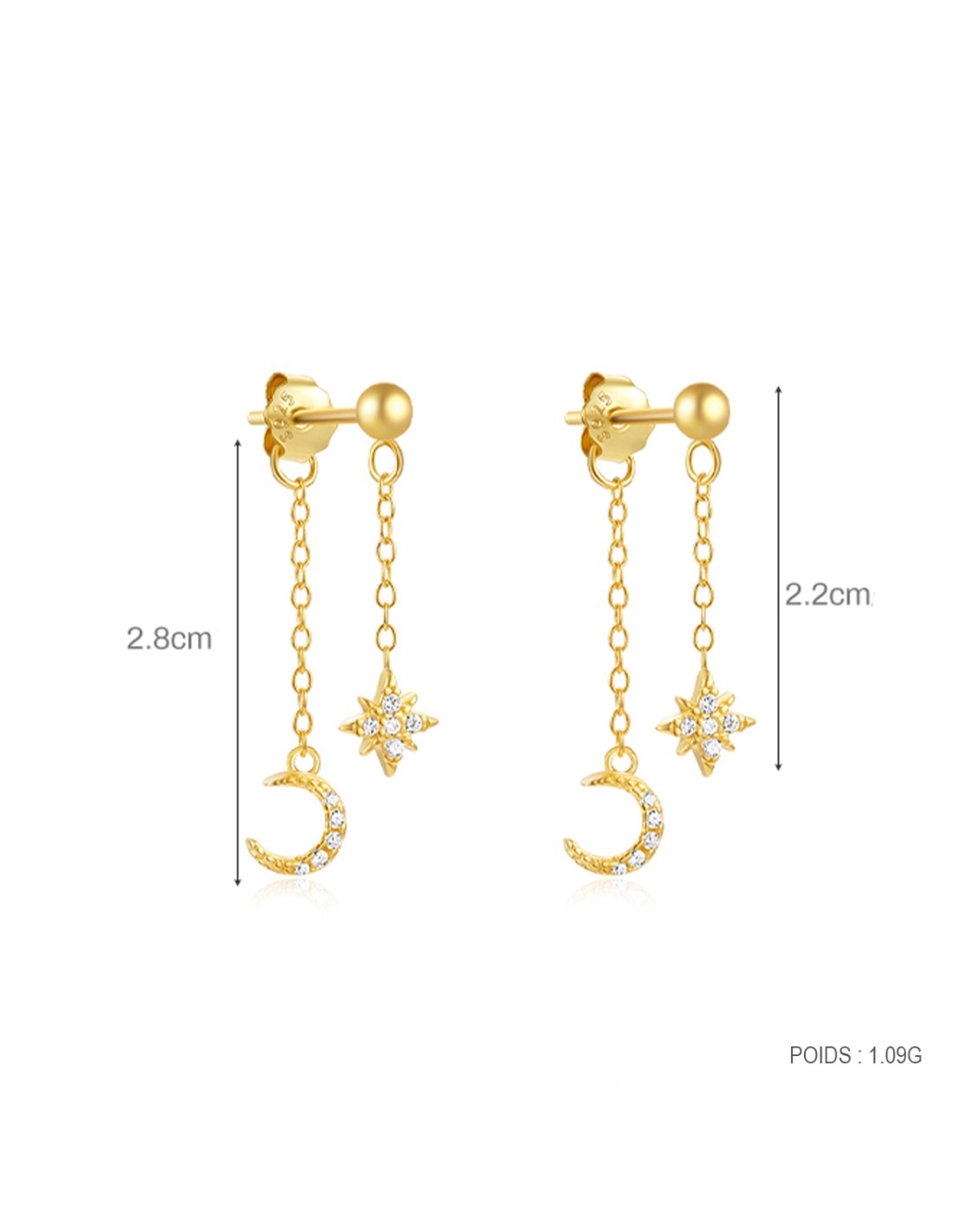 Ces boucles d’oreilles en argent 925/000 doré à l'or fin séduisent par leur design délicat et contemporain. Deux puces boule avec au bout de la chainette une pampille étoile. Avec l'arrière papillon, une chainette avec au bout une étoile ornée de zirconiums.