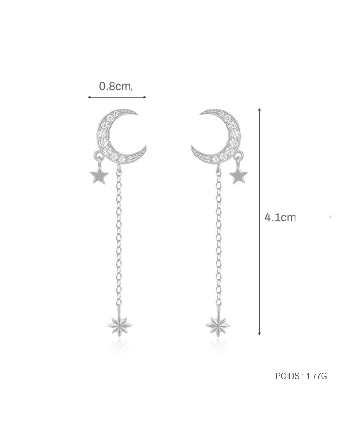 Ces boucles d’oreilles en argent 925/000 séduisent par leur design délicat et contemporain. Deux puces motif lune ornée de zirconiums avec deux pampilles étoiles.
