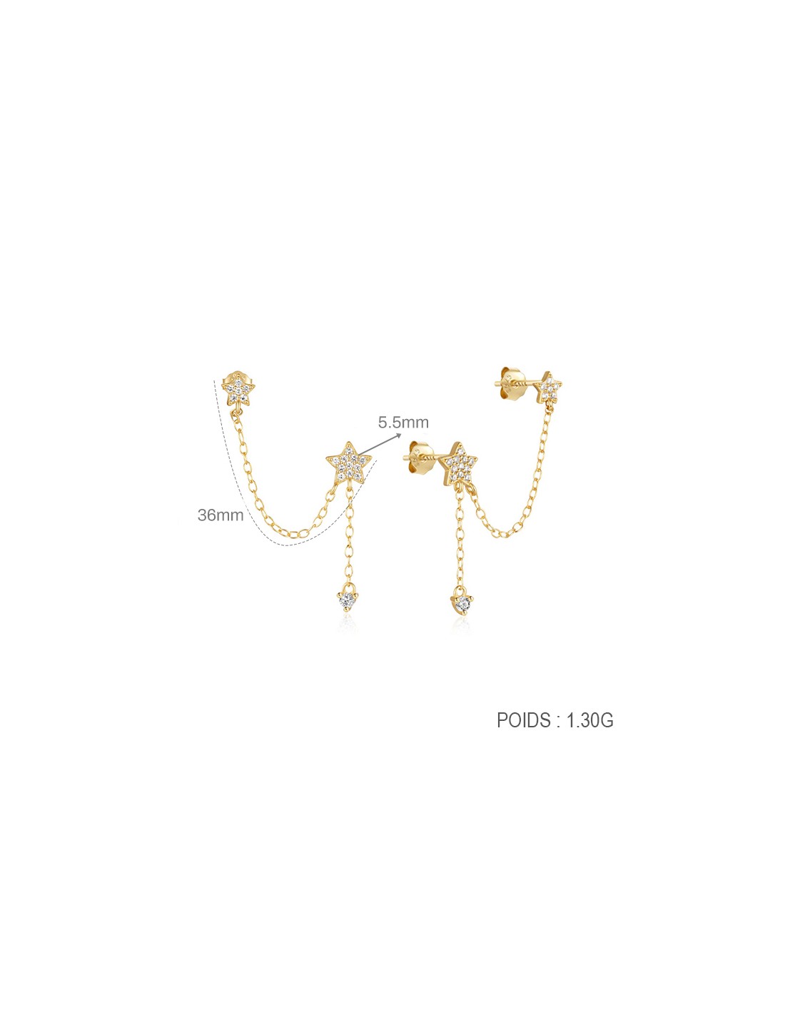Ces boucles d’oreilles en argent 925/000 doré à l'or fin séduisent par leur design délicat et contemporain. Deux puces à motif étoiles avec pampille et chainette reliée, nécessite que la personne doit être percée deux fois sur la même oreille pour pouvoir le porter.