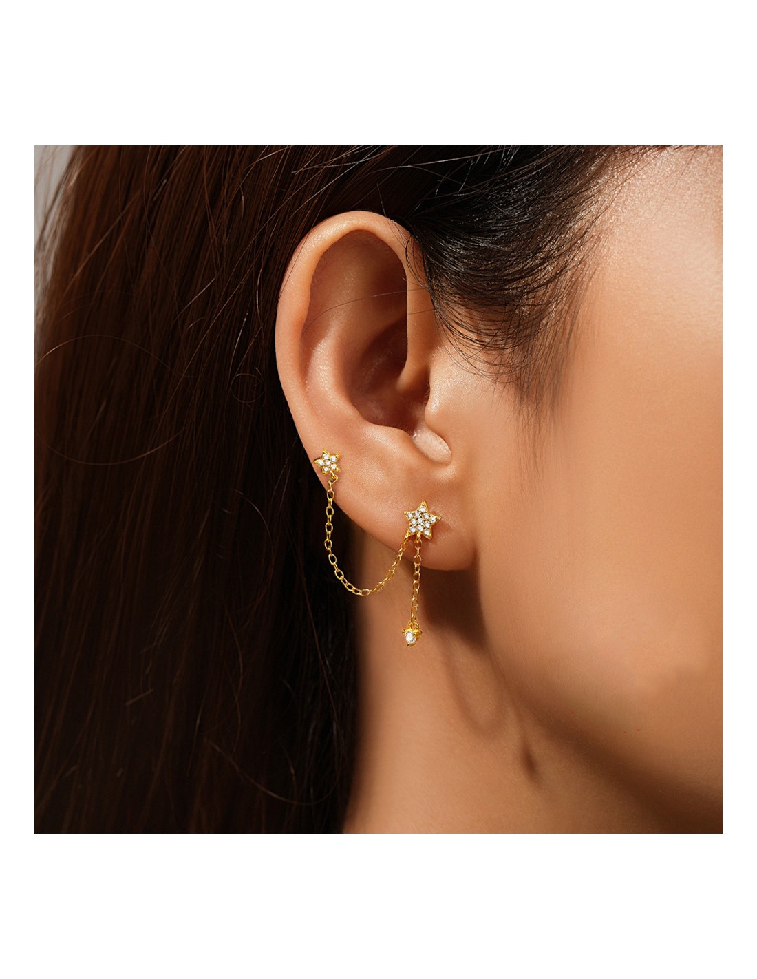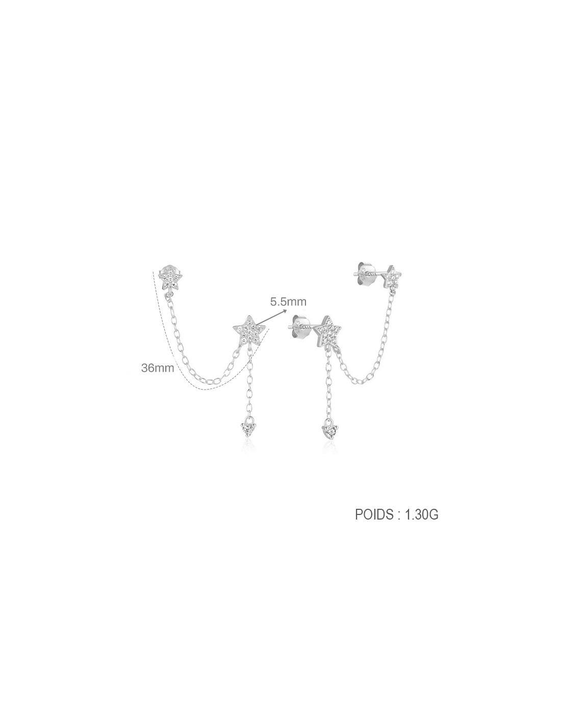 Ces boucles d’oreilles en argent 925/000 séduisent par leur design délicat et contemporain. Deux puces à motif étoiles avec pampille et chainette reliée, nécessite que la personne doit être percée deux fois sur la même oreille pour pouvoir le porter.