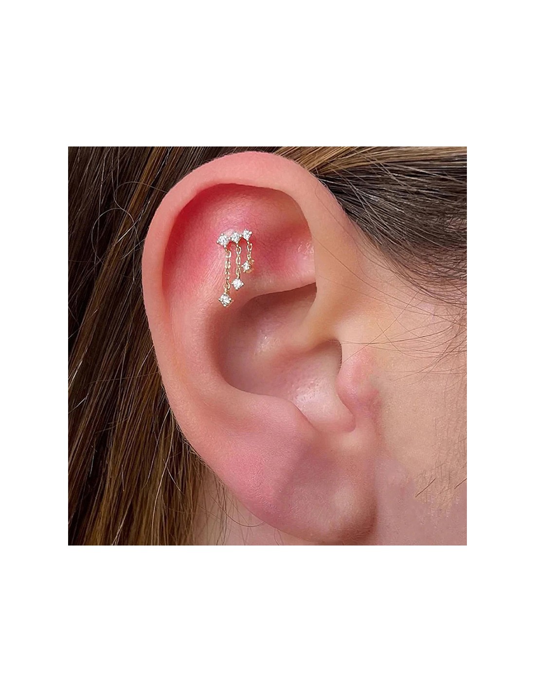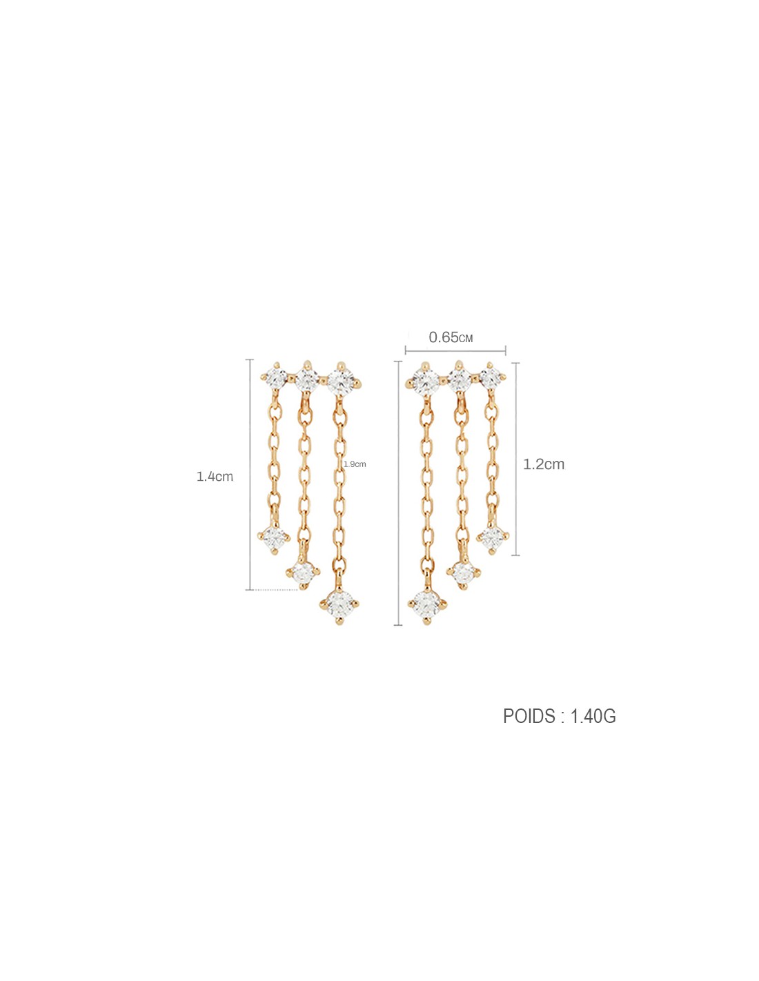 Ces boucles d’oreilles en argent 925/000 doré à l'or fin séduisent par leur design délicat et contemporain. Deux puces à motif barette avec trois zirconiums et trois petites chainettes pendantes.