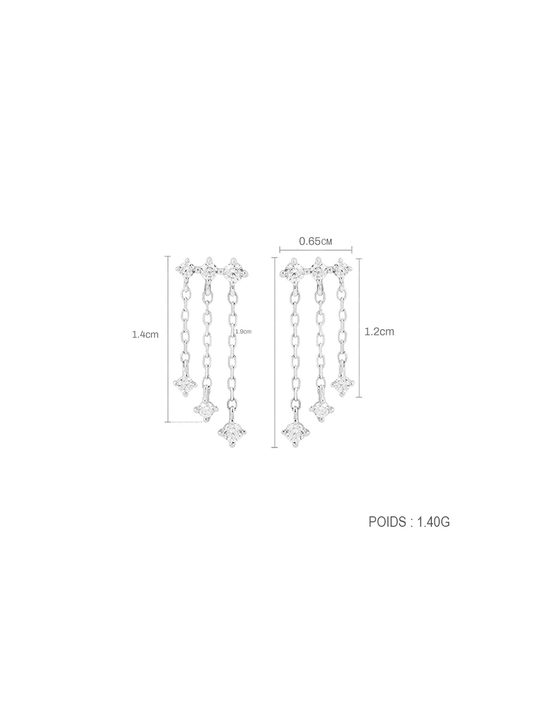 Ces boucles d’oreilles en argent 925/000 séduisent par leur design délicat et contemporain. Deux puces à motif barette avec trois zirconiums et trois petites chainettes pendantes.