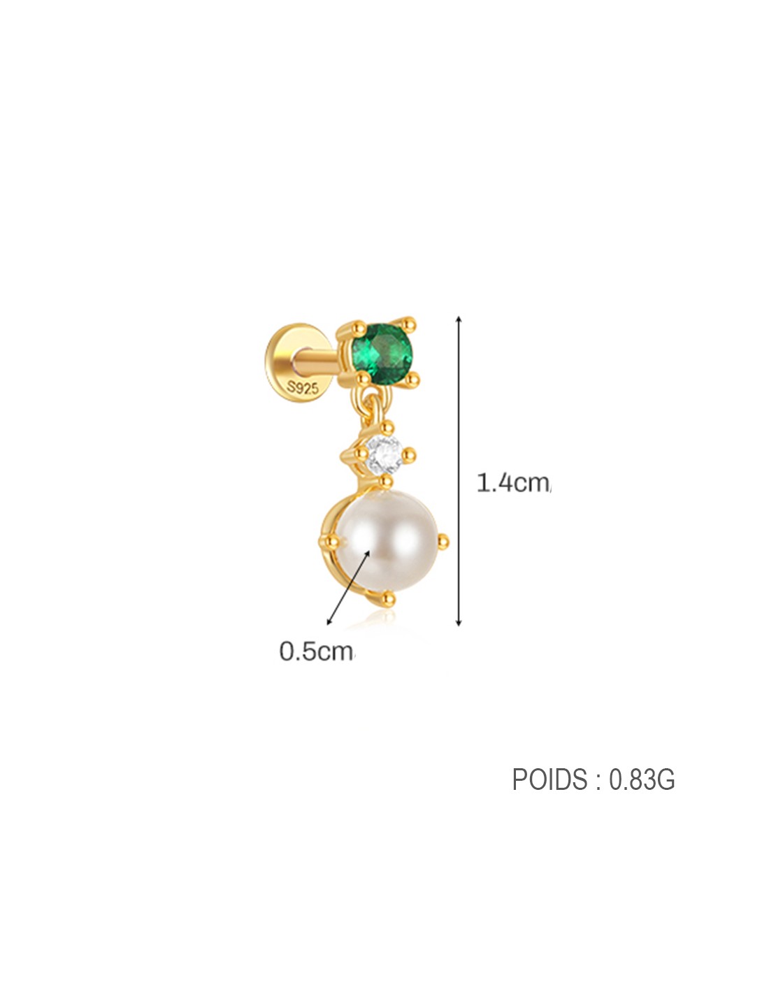 Labret VERT ET PERLE 1,2mm - argent 925 doré à l'or fin