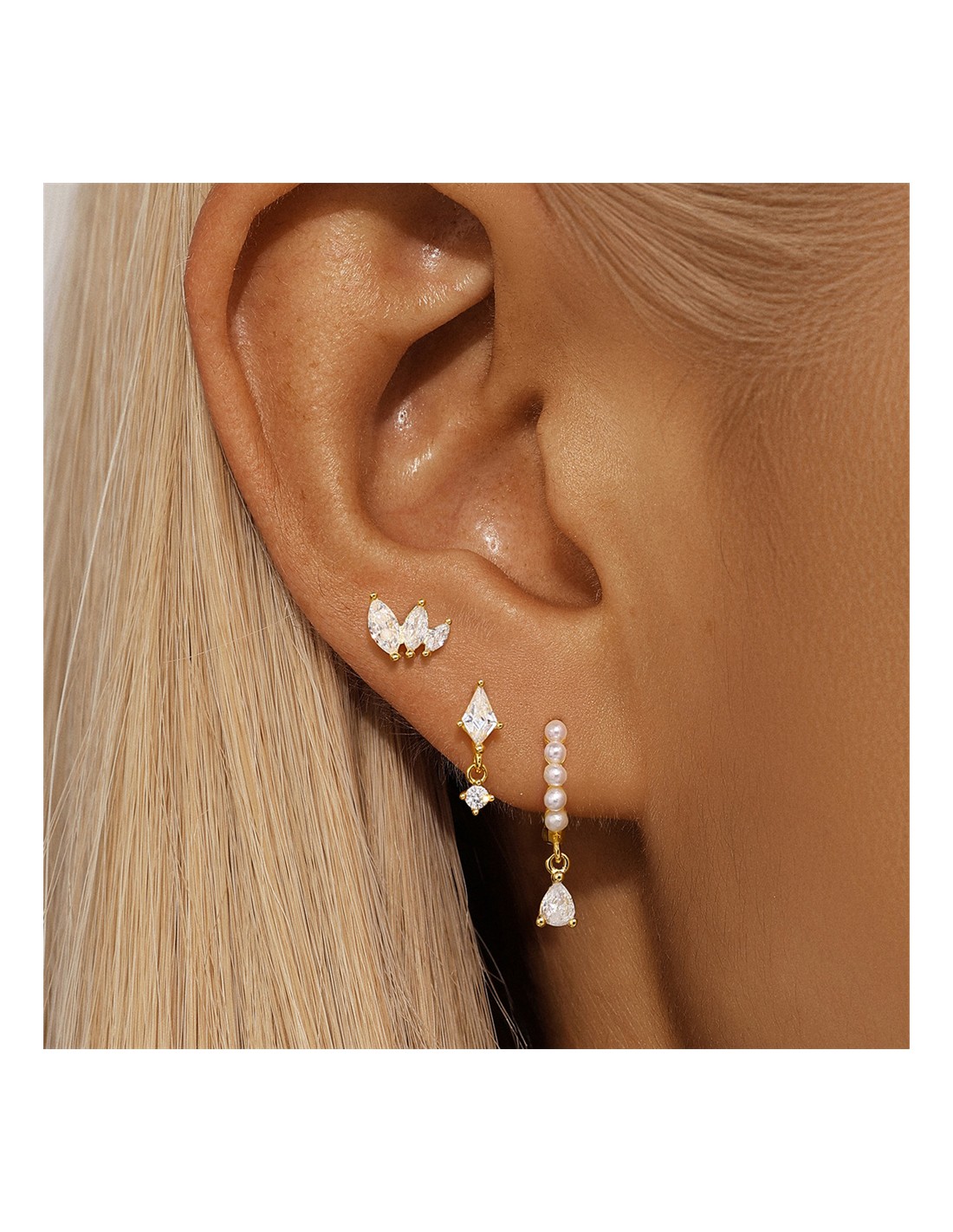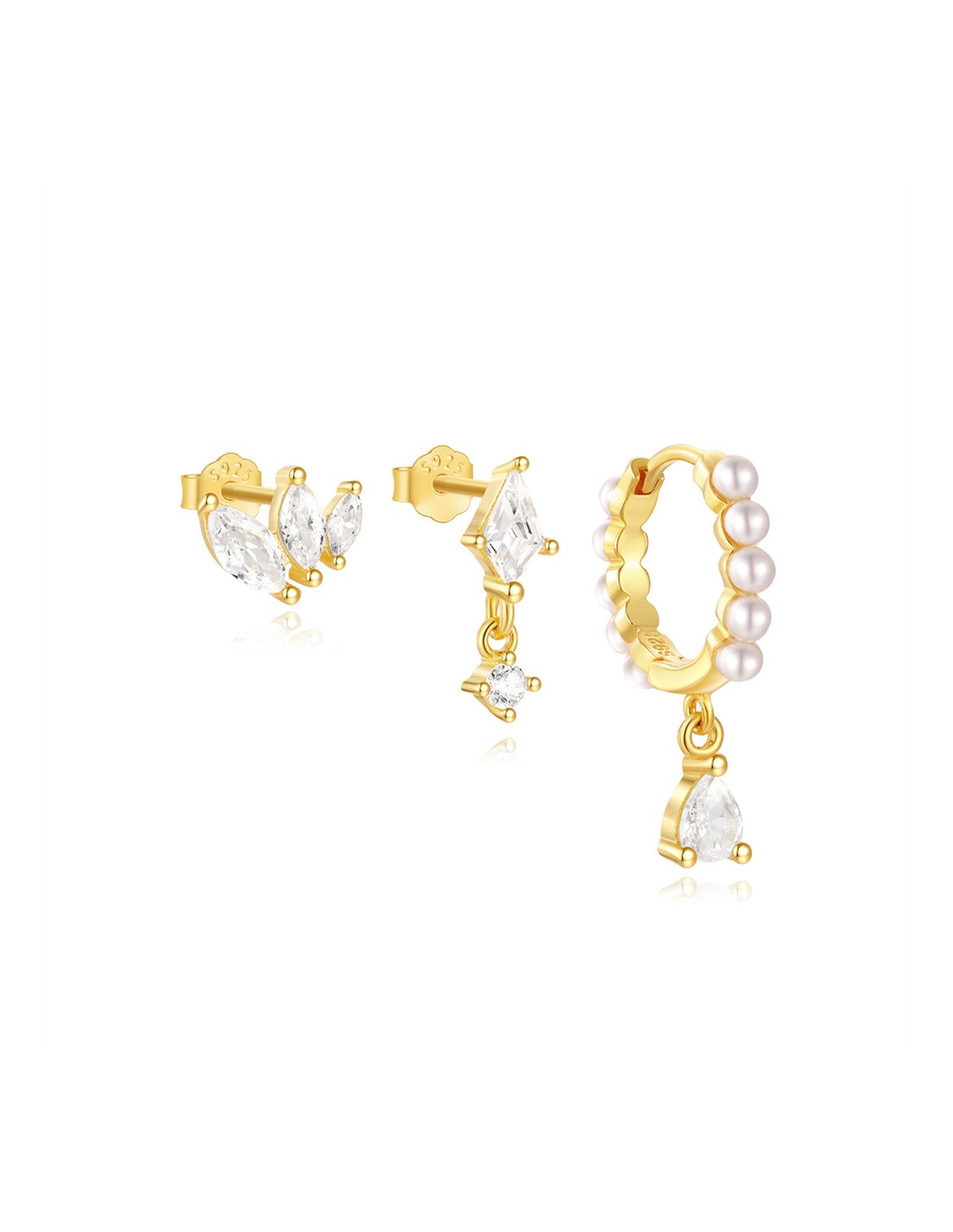 Ce trio raffiné en argent 925/000 doré à l'or fin associe des zirconiums scintillants, une boucle pendante délicate et une créole Ø8mm ornée de perles. Idéal pour être porté seul ou en accumulation.