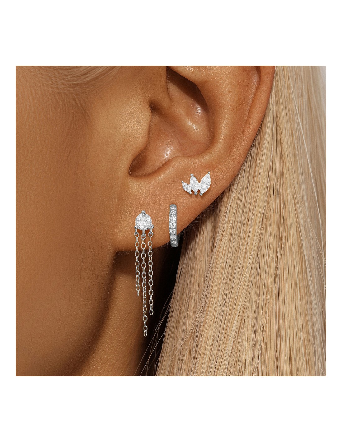 Ce trio raffiné en argent 925/000 associe des zirconiums scintillants, une créole ornée de zirconium et une boucle pendante avec des chaines fines. Idéal pour être porté seul ou en accumulation.