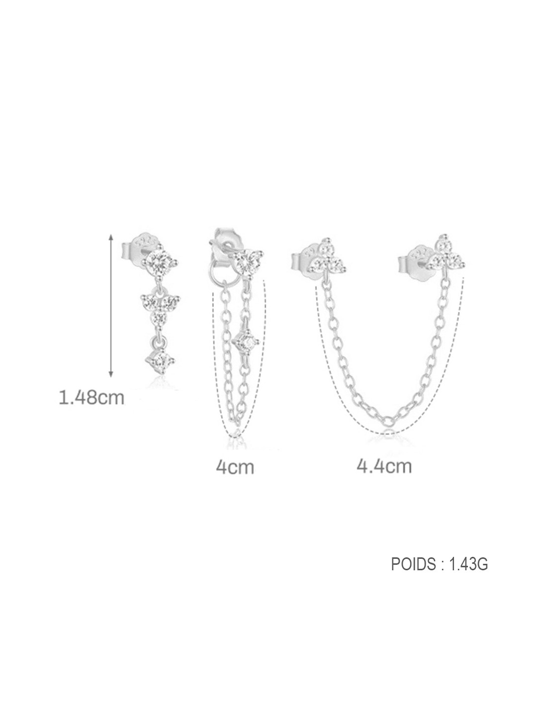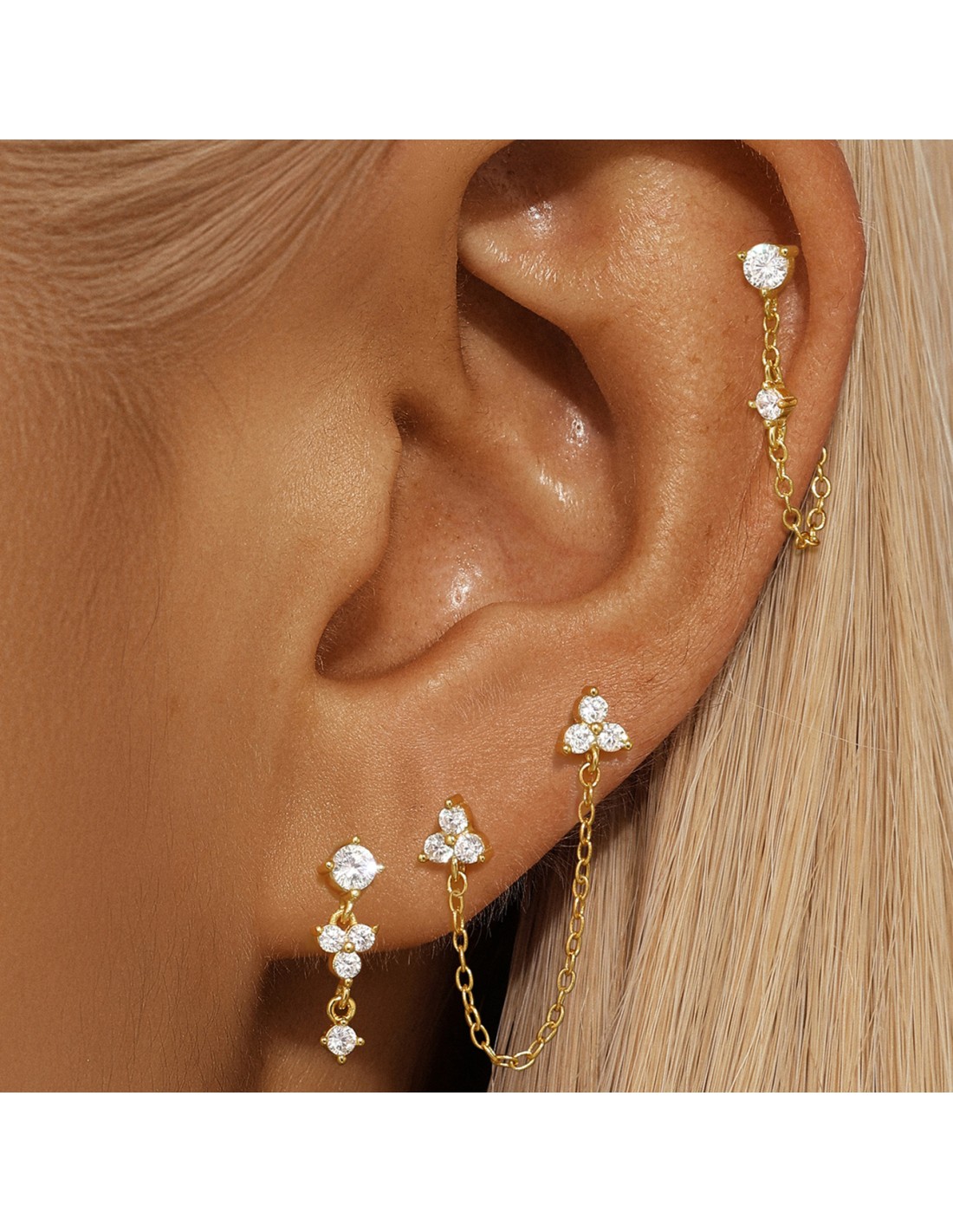 Ce trio raffiné en argent 925/000 doré à l'or fin associe des zirconiums scintillants, deux boucles pendantes délicates avec une chaine fine. Idéal pour être porté seul ou en accumulation.