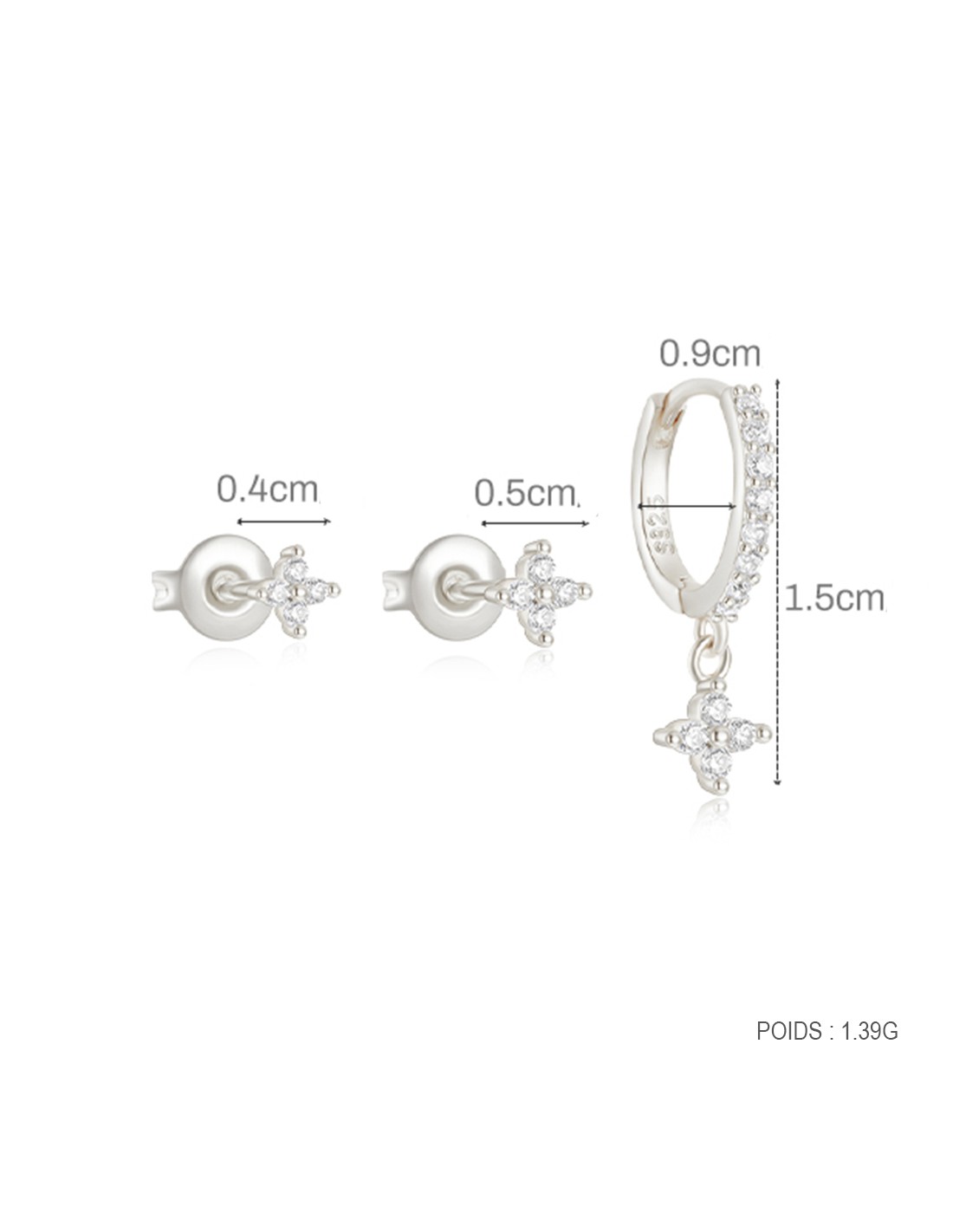 Ce trio raffiné en argent 925/000 fin associe deux puces en forme de fleur et une créole orné de zirconiums avec une pampille motif fleur. Idéal pour être porté seul ou en accumulation.