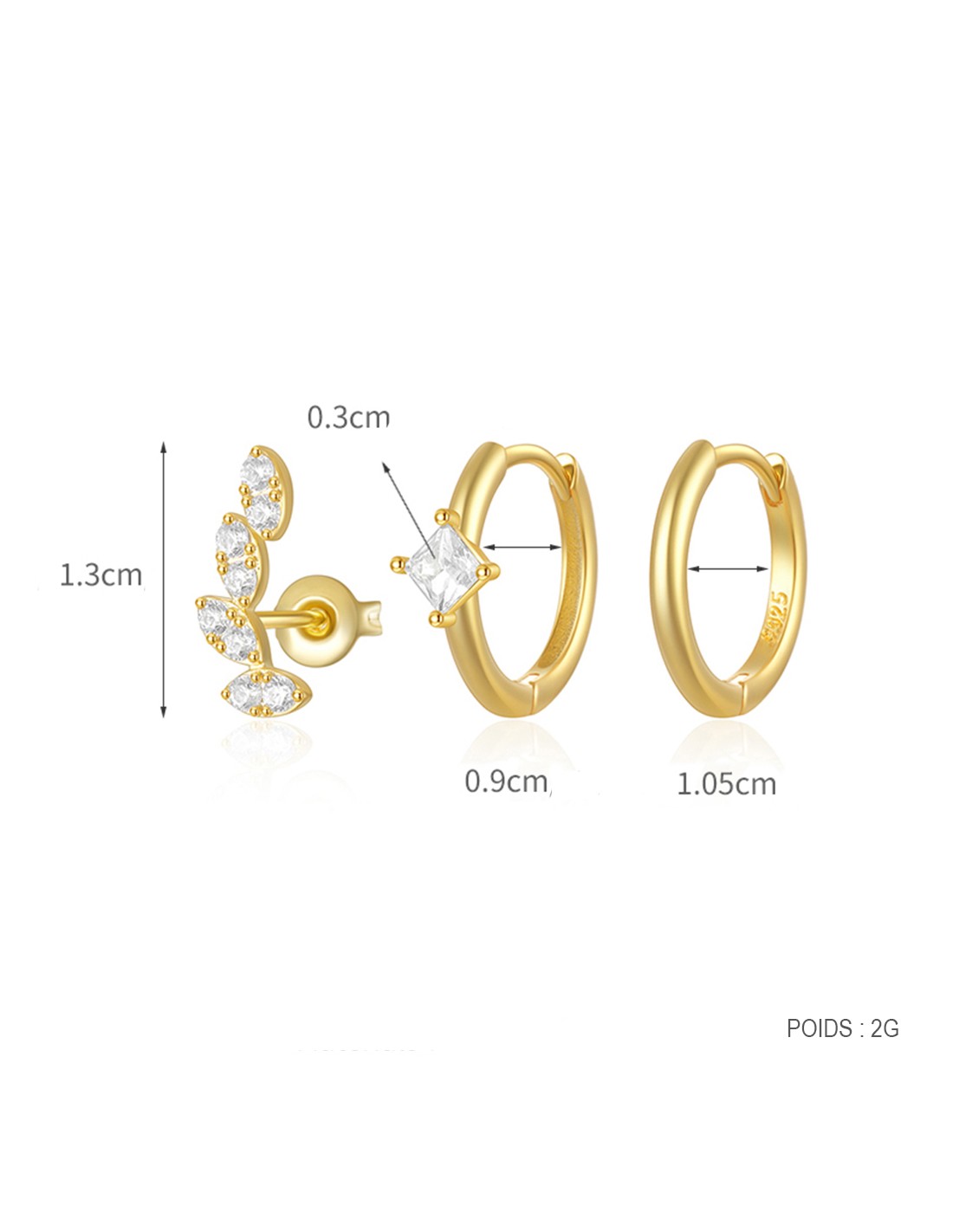Ce trio raffiné en argent 925/000 doré à l'or fin associe une puce motif feuille et deux créoles simple. Idéal pour être porté seul ou en accumulation.