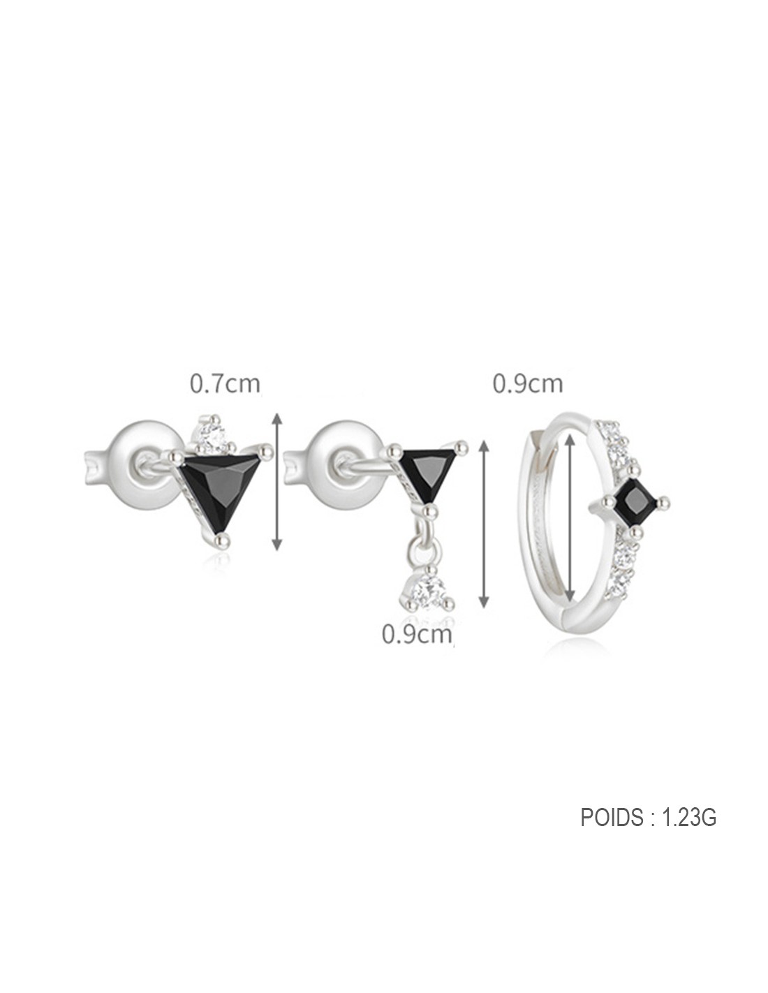 Ce trio raffiné en argent 925/000 associe deux puces en forme triangle et une créole Ø9mm orné de zirconiums avec au milieu un zirconium noir carré. Idéal pour être porté seul ou en accumulation.